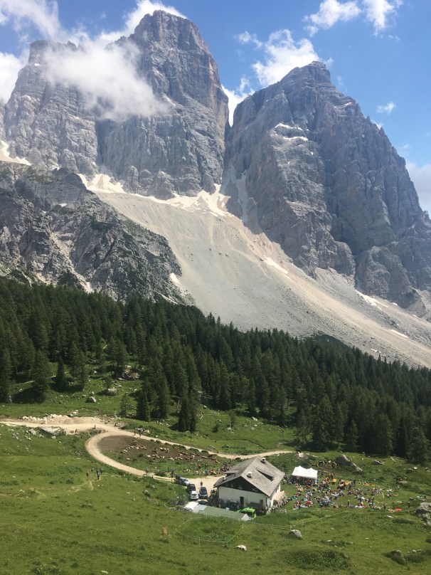 We passed an intense bike race and stopped to watch it for a bit, which was amazing and so energizing. Our hut for the night, Rifugio Citta di Fiume, was so amazing–overlooking the giant mountain Pelmo. We arrived fairly early just as an all men’s a cappella choir was finishing up a set for a celebration of 100 years since the end of the Great War.