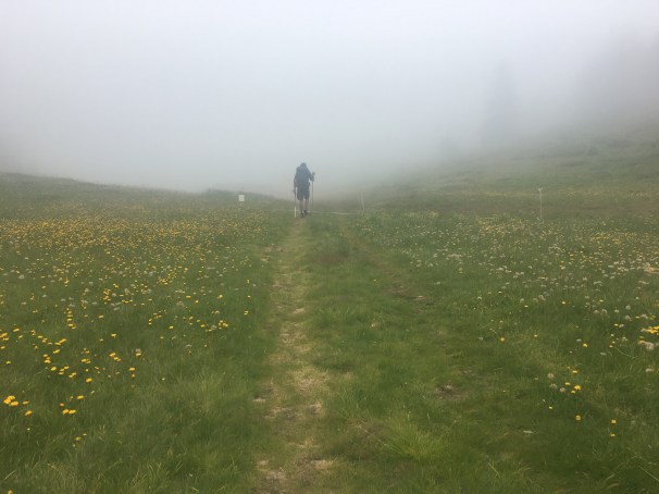But the silver lining was that we made it fairly quickly to Rifugio Carestiato, which was a lovely place with a cozy fireplace. It also had one of the best meals of all of the rifugios–a delicious roasted chicken drumstick with potatoes and an incredible dessert of panna cotta with raspberries–and looking out on the massive storm that came at night was pretty spectacular.