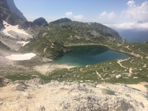 Looking over Lago di Lagozoui on AV1, you can almost make out Rifugio Lagozuoi in the upper left/center jutting up off the mountaintop.
