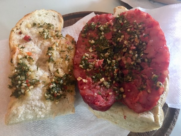 Nuestra Parilla brings the laid-back vibe to a new level: for instance, it opens whenever the grill-master decides to open it, so we waited anxiously about thirty minutes after the listed opening time until they had rolled up the shutter to open for lunch and joined the queue. While in line, we watched, completely mesmerized, as the grill-master manned the massive grill—covered with chorizos and massive slabs of pork—with an incredible rhythm. After watching a few orders go through, we decided to not only order the infamous choripan—a large chorizo sandwich (we’re talking the size of my face) covered in fresh and flavorful chimichurri that is a Buenos Aires staple—but also the bondiola, because that’s what most of the people in front of us in line were ordering. It is three massive slices of pork loin doused with salt and pepper, and really weighing down some fresh bread. Needless to say, we didn’t come close to eating all of it but we gave it our best try. The choripan was absolutely the star of the meal.