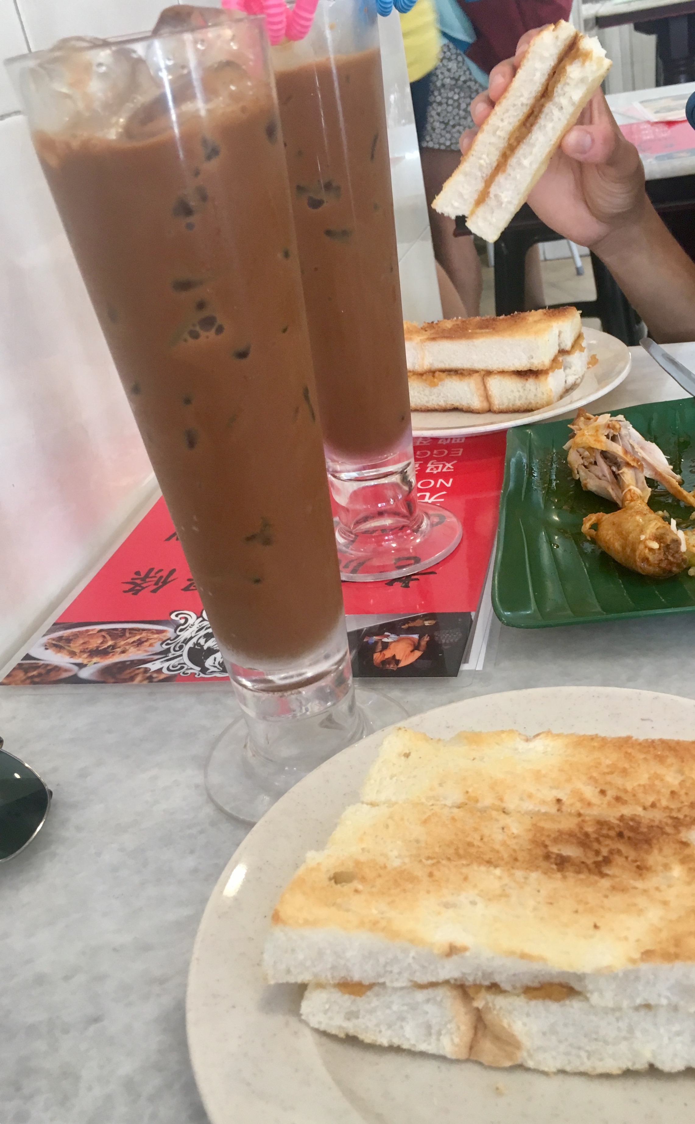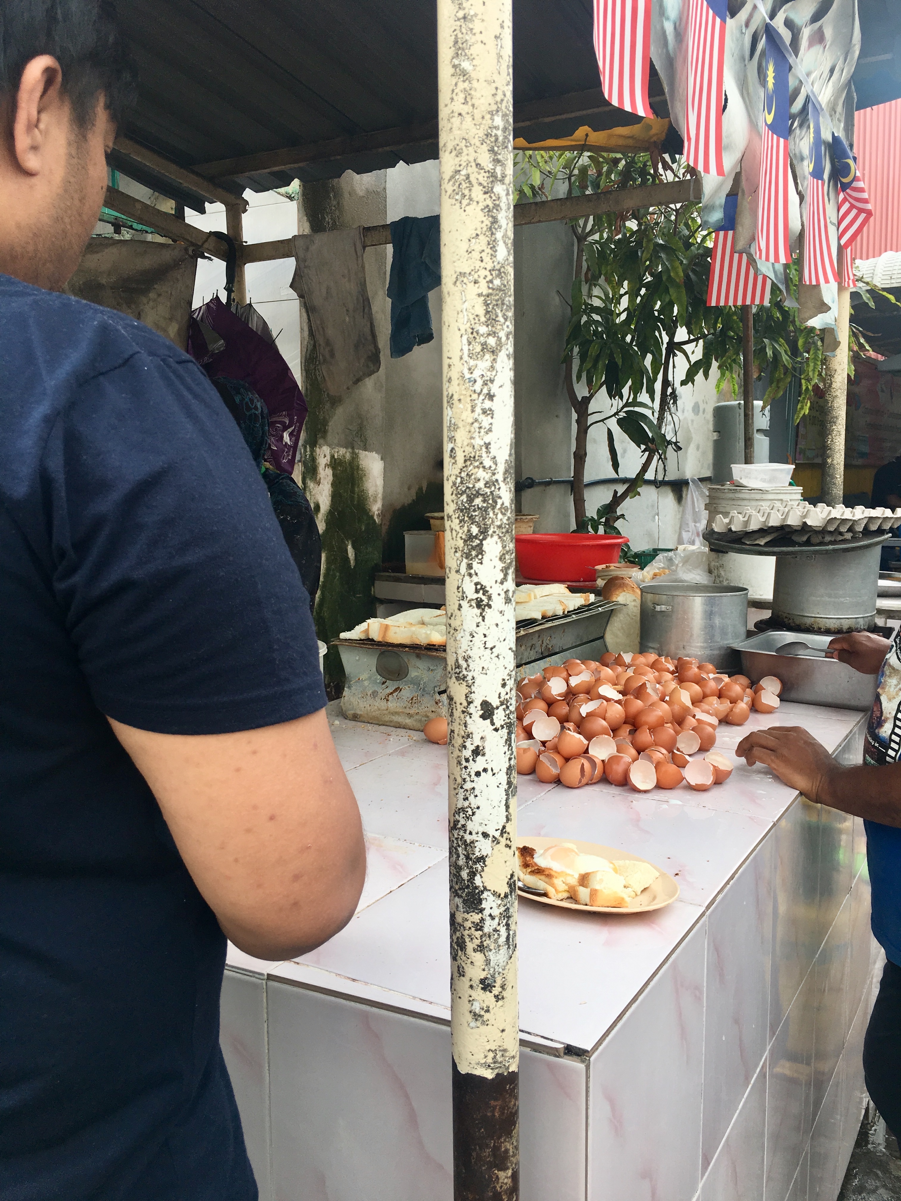 We also found remarkable Kaya toast at a stall on the corner of Jalan Transfer & Jalan Ariffin (‘jalan’ means road), sharing prime street-side real estate with a bomb Roti Canai spot. There was an absurdly long line (and even police directing car traffic around foot traffic because it was a national holiday, so especially crowded) but it was oh so worth it–the Kaya toast stall is run like a smooth machine by a woman with the help of her husband and her son!